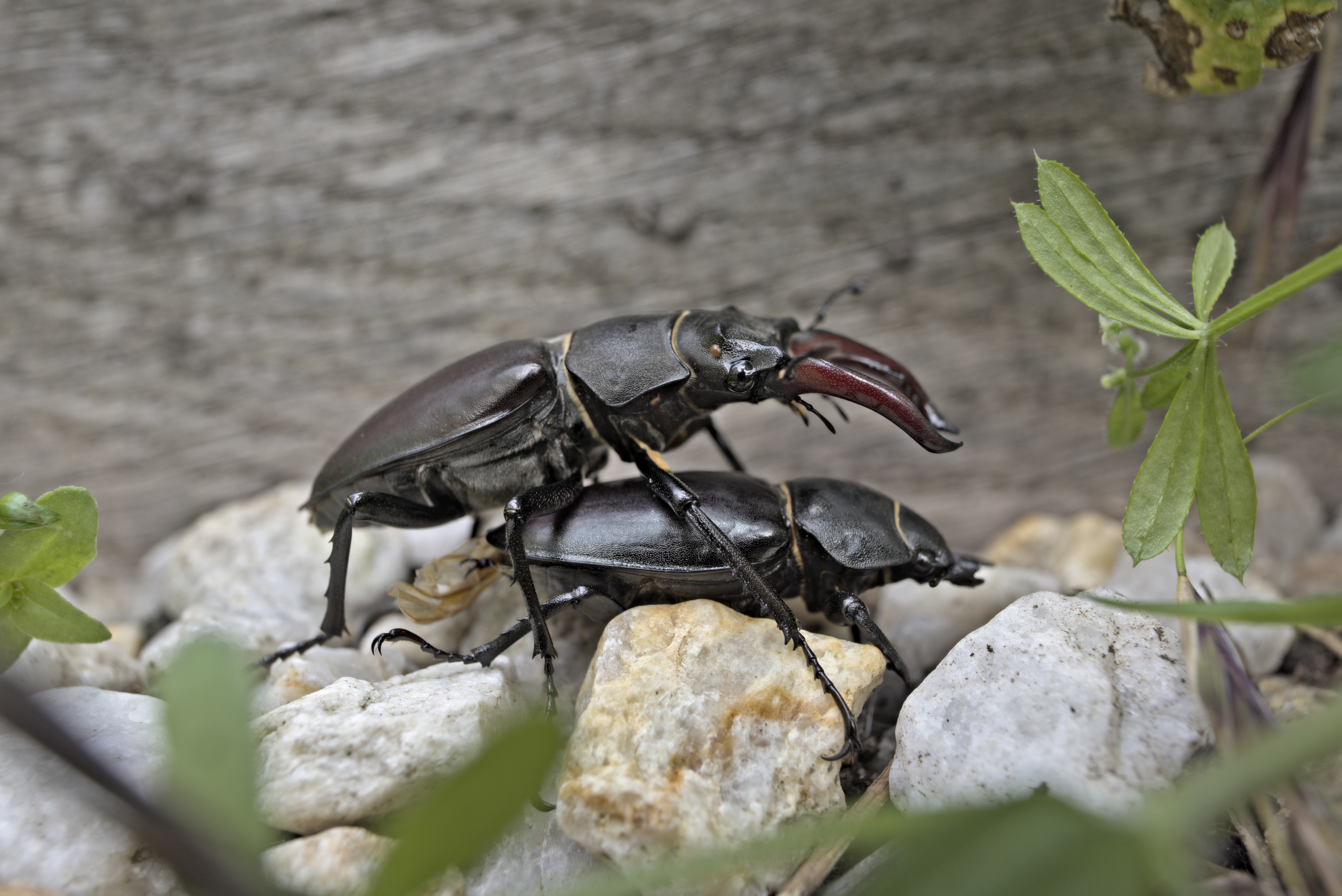 Deux lucanes cerfvolant, un mâle et une femelle, se promènent dans le potager en période d'accouplement. Le confinement ayant largement diminué l'activité humaine les mois précédents, la faune locale profite d'autant plus des printemps et été.