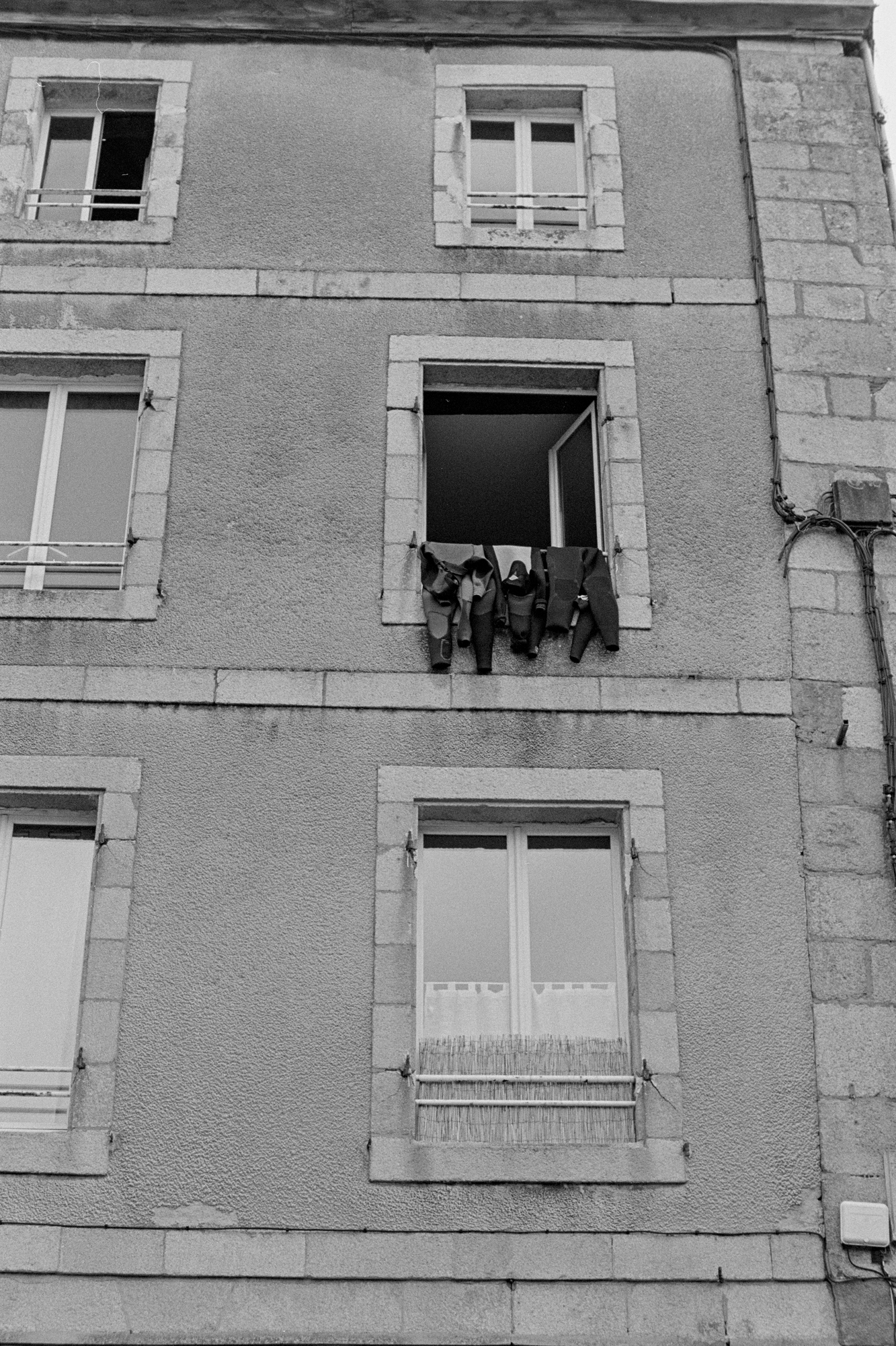 Des combinaisons de plongée sèchent à la fenêtre.
