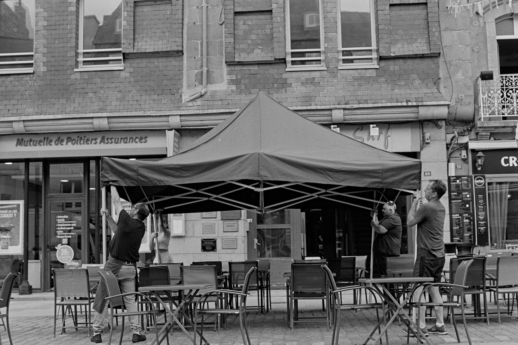 Montage du barnum afin de protéger la terrasse de la crêperie.